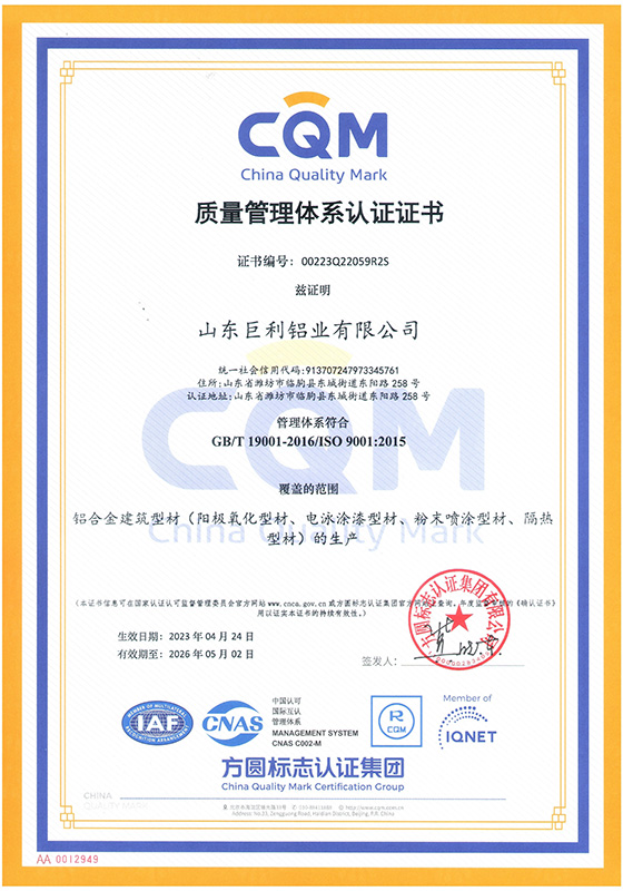 山東巨利鋁業有限公司是大型專業化鋁合金門窗、幕墻建筑型材生產企業。公司座落于中國江北最大鋁合金建筑型材生產、銷售集散地,被稱為“中國鋁業之都”的臨朐,地處山東半島中部,濰坊市西南部,沂山北麓,公司西臨彌河,東靠長深高速,北接濟青高速,地理位置優越,交通十分便利。公司占地總面積18.5萬平方米,擁有國際先進水平的擠壓、陽極氧化、電泳涂漆、粉末噴涂、氟碳噴涂、木紋轉印、隔熱斷橋等系列生產線,年生產節能環保鋁型材7萬噸。公司先后通過IS09001質量管理體系認證、ISO14001環境管理體系認證、0HSAS45001職業健康安全管理體系認證、IATF16949汽車行業質量管理體系認證和中國綠色建材產品認證。公司先后榮獲山東省專精特新中小企業、山東省高新技術企業、山東省科技型中小企業榮譽稱號。“客戶的滿意,巨利的追求”。不斷的改進和完善質量管理,不斷的提高售后服務水平,持續向客戶提供一流的產品和一流的服務,是我們巨利人孜孜以求的永恒目標,我們愿與廣大業務同仁共同努力,共創雙贏,不斷發展,走向更加輝煌的明天。